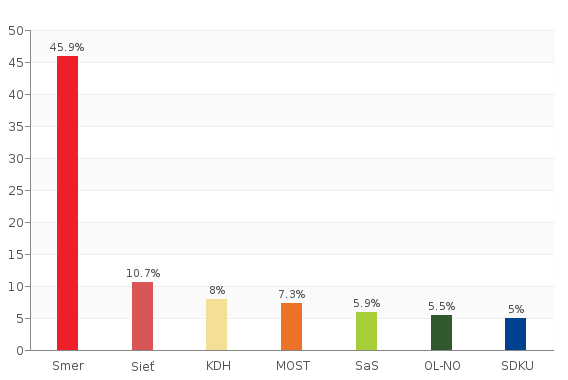 Na štvrtom mieste v prieskume je strana Most-Híd so ziskom 7,3 percenta, nasleduje SaS s 5,9 percenta, Obyčajní ľudia a nezávislé osobnosti, ktoré dostali 5,5 percenta hlasov respondentov a SDKÚ-DS s piatimi percentami. Brány parlamentu by neprekročila SMK so ziskom 3,9 percenta a SNS by dosiahla 3,5 percenta. Podpora žiadnej ďalšej strany ani hnutia by nepresiahla tri percentá. O prieskume informoval riaditeľ spoločnosti MEDIAN SK Jindřich Bardon.