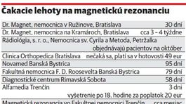 Anketa denníka Pravda ukázala, že najdlhšie čakacie lehoty na vyšetrenie magnetickou rezonanciou sú v Banskej Bystrici, termíny presahujú tri mesiace, v Trnave je to 78 dní, v Rimavskej Sobote 58. Najmenej sa bez poplatkov čaká v súkromnom centre Alfamedia v Trenčíne, iba tri dni.
