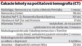 V niektorých mestách dostávajú pacienti, ktorých posiela na vyšetrenie ambulantný lekár, termíny až o tri mesiace. Pri objednávaní nepomáha ani argument, že ich diagnóza je vážna a každá minúta je drahá. Zistil to denník Pravda vo svojej ankete. Naši redaktori sa vydávali za pacientov, ktorí trpia silnými bolesťami v spodnej časti chrbtice, a žiadali rýchle vyšetrenie. Spolu zatelefonovali na 29 pracovísk po celom Slovensku, z toho do 16 centier magnetickej rezonancie a na 13 pracovísk počítačovej tomografie (CT).