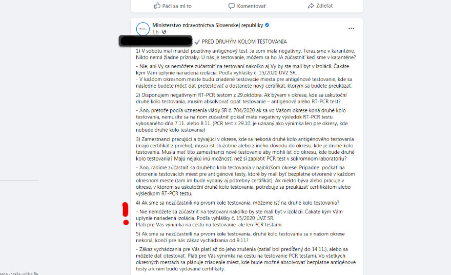 Vo štvrtok ráno rezort zdravotníctva uverejnil na svojom webe otázky a odpovede, medzi ktorými svieti otázka číslo 4: Ak sme sa nezúčastnili na prvom kole testovania, môžeme ísť na druhé kolo testovania? Odpoveď: Áno, môžete. Platí pre vás výnimka na cestu na testovanie antigénovými testami s certifikátom MZ SR.
